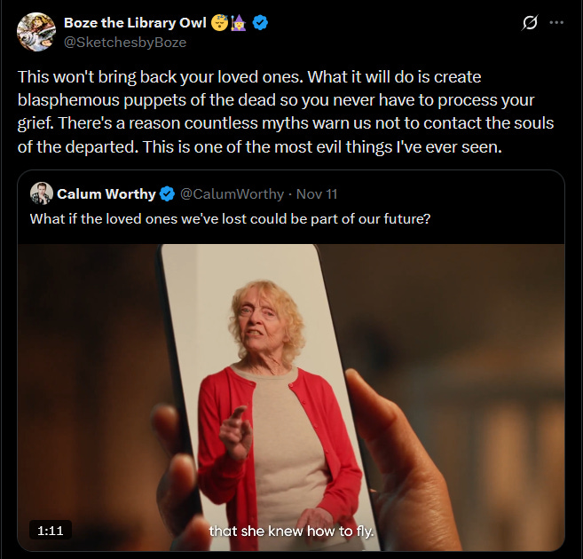 I’ve mentioned before how philosopher Erik Voegelin said the Book of Genesis contains the two oldest truths in the world: one, that all living things are mortal, finite; and two, that the mystery of existence is impenetrable. Abominations like the aforementioned app violate both of these core truths. They operate under the false assumption that the fullness of a person’s existence can be captured, and uploaded to the cloud, in just a few minutes. And they teach that in so doing, they can banish humanity’s most durable foe, death. You thought your Aunt Lisa died and was buried, but no—there she is, in your phone, asking about your tuna casserole. You no longer need to grieve, because she is with you always (assuming that Cloudflare stays running, and you don’t cancel your subscription, in which case—farewell, Lisa!).
